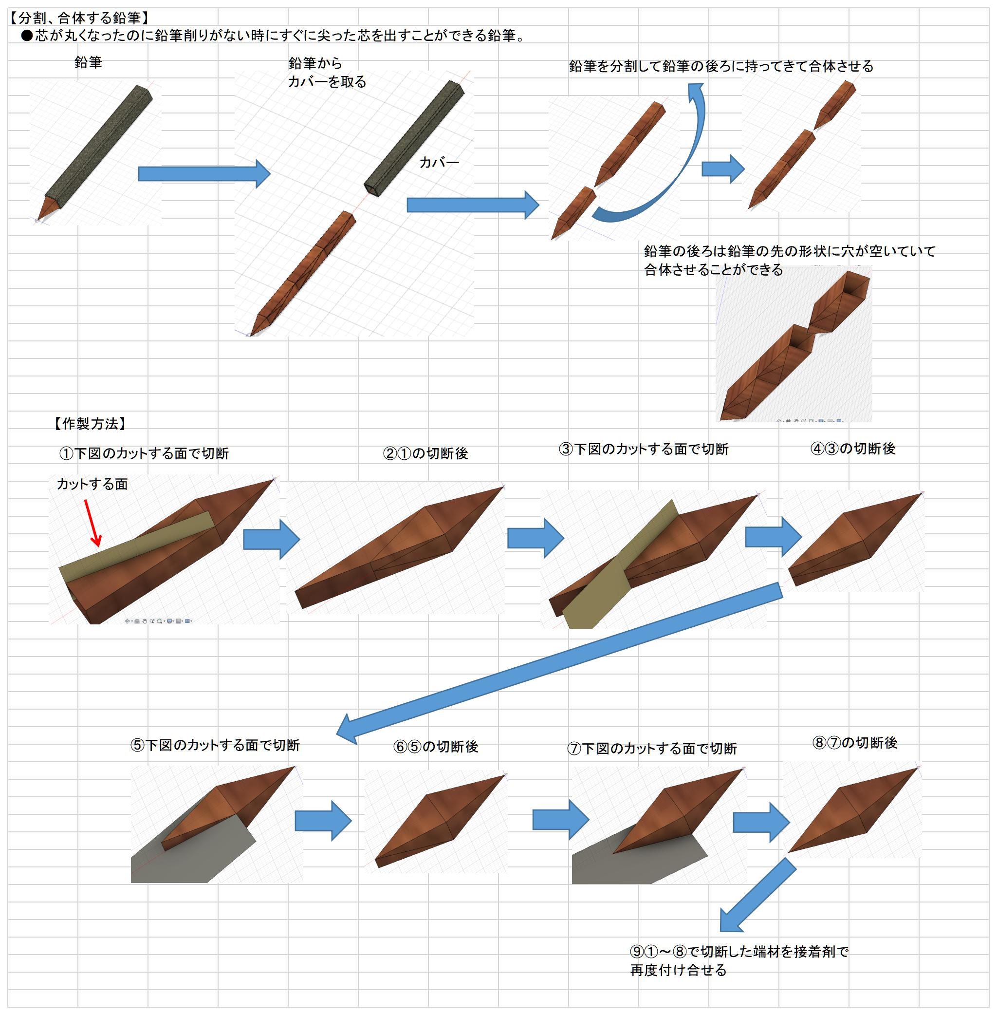 芯が丸くなったのに鉛筆削りがなく困った時に、分割して新しい芯を出すことができる鉛筆です。