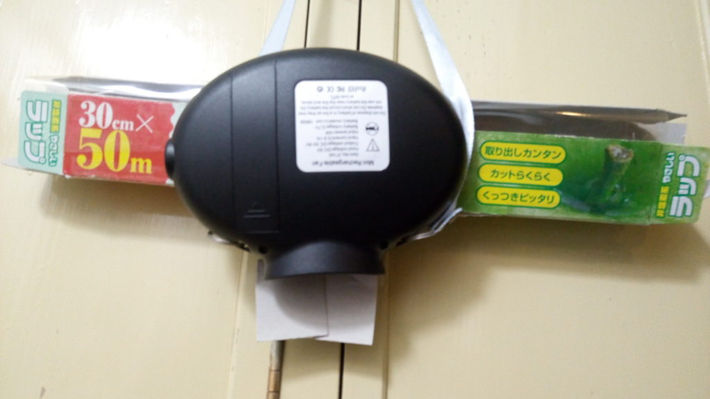 何でラップの箱を使ったかというと、ファンだけだと吸込み口が壁やタオルとくっついて十分な量の空気を吸えなくなる恐れがある為、壁やタオルからの距離を離す為に箱を設けました。