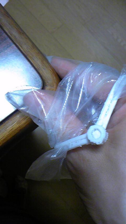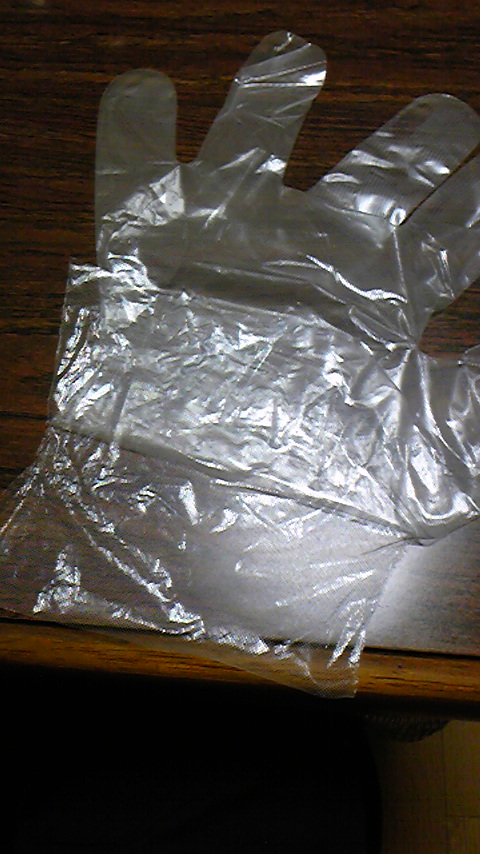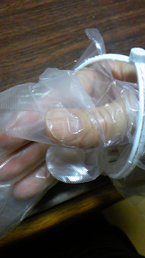 開閉口の間のスリットにビニール手袋のカットした部分を通します